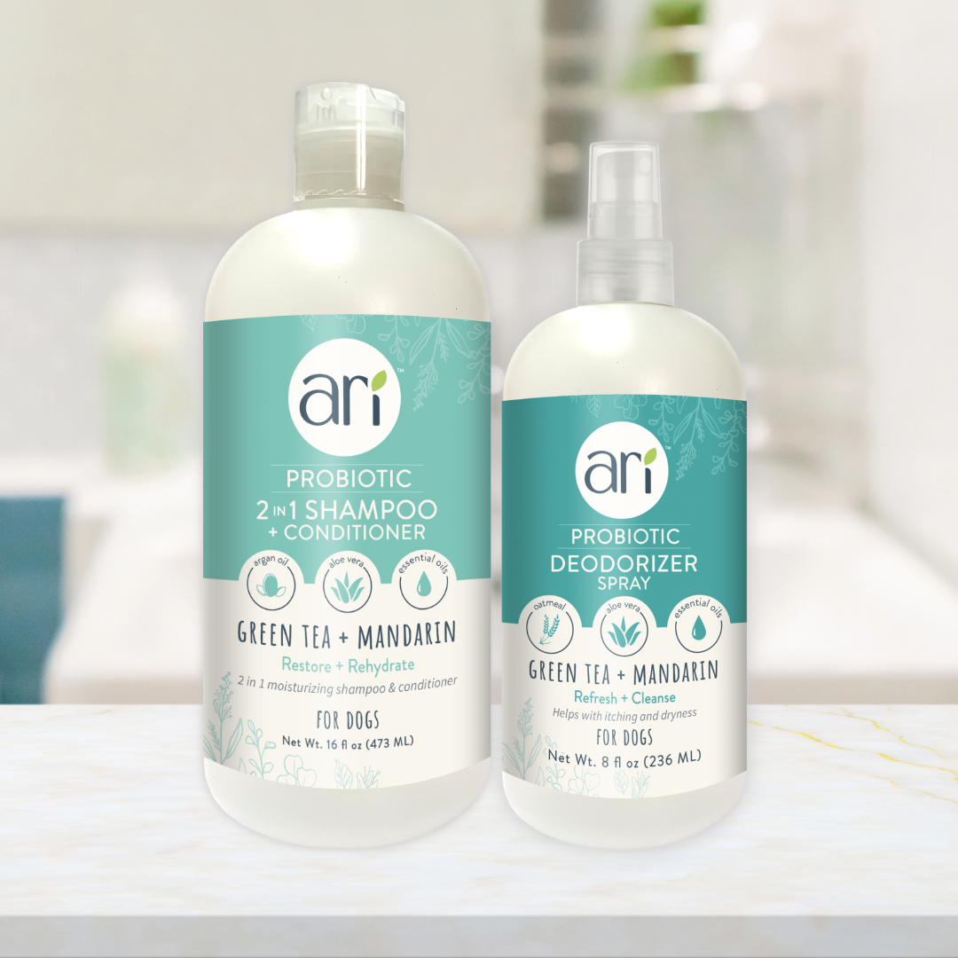 Includes Ari Probiotic 2-in-1 Shampoo & Conditioner and Deodorizer Spray (Green Tea & Mandarin scent).